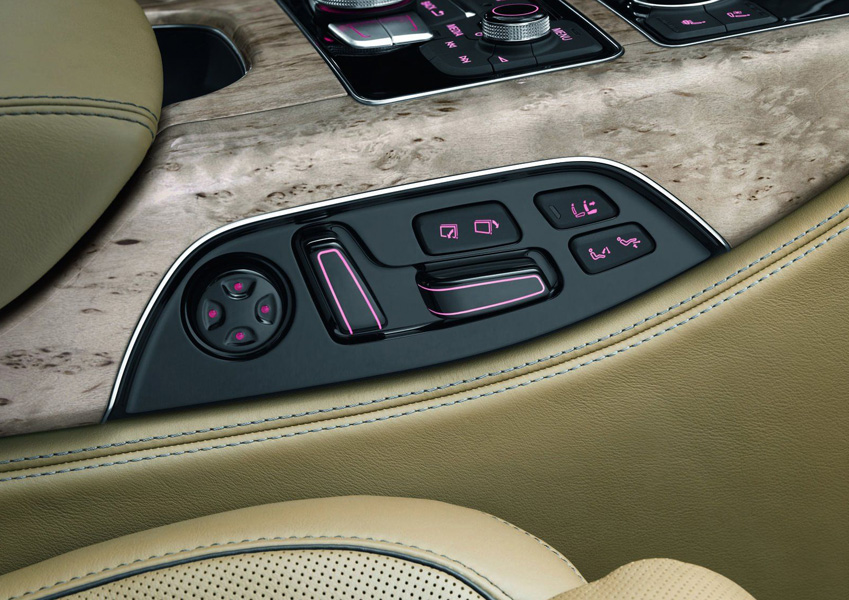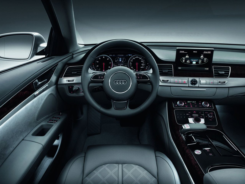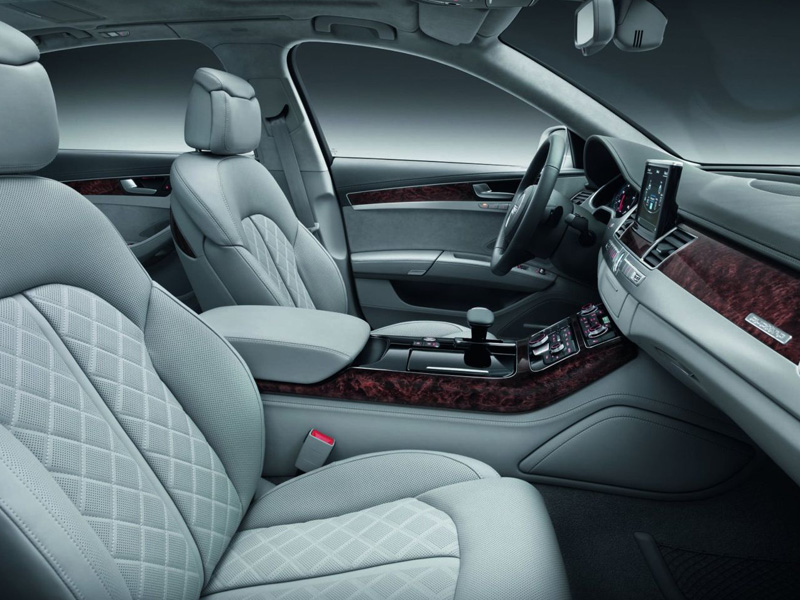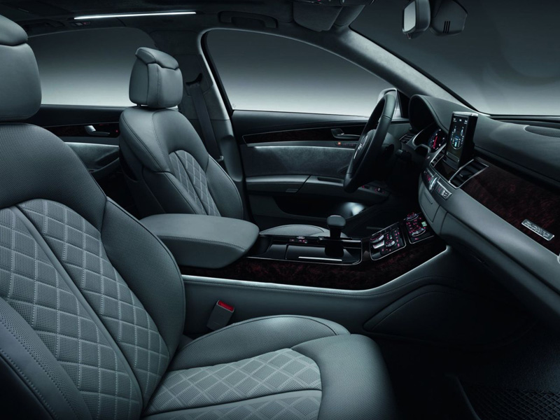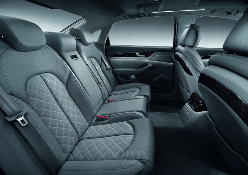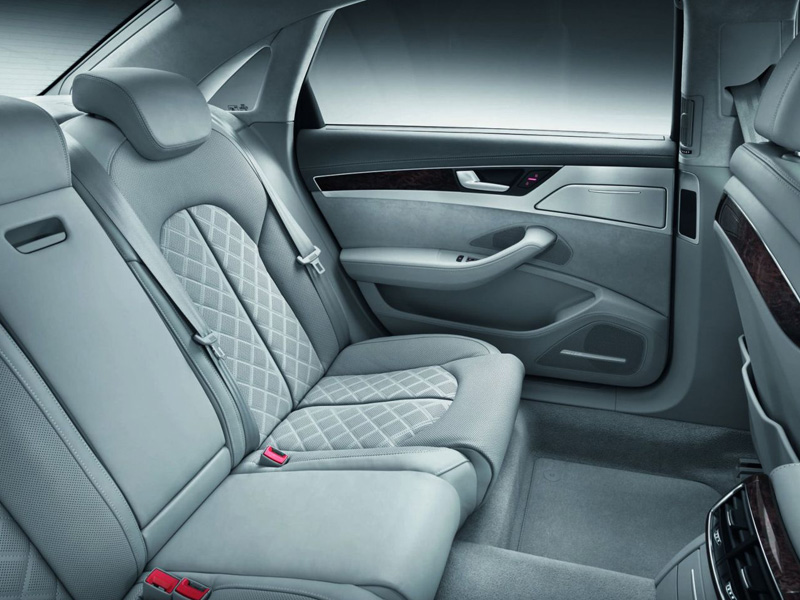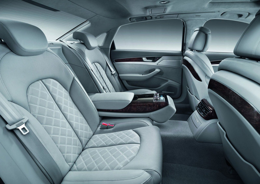 А8 избалует пассажиров задних кресел комфортом и различными опциями: два раздельных, ругулируемых электроникой, кресла, для которых предусмотрен подогрев и вентиляция, длинная центральная консоль, которая может быть оснащена складным столиком и холодильником, а так же четырёхзонный климат контроль.