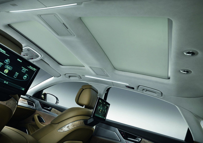 Другие опции включают систему MMI, спутниковую навигацию 3D с системой Google Earth, аудиопакет Bang & Olufsen на 19 колонок, панорамную прозрачную крышу и тёмную кожу Valonea для салона.