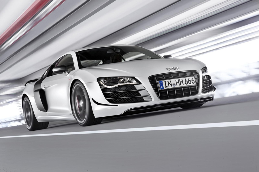 Что каcается двигателя, то он остался прежним: 5.2-литровый V10. При стандартых условиях вождения 85% мощности идут на заднюю ось. Инженеры, поработавщие с блоком управления двигателем, подняли его мощность со стандартных 518 л.с. до 553 л.с., а максимальный вращающий момент достиг 540 нм при 6500 оборатах. Audi посчитали, что для такого автомобиля вполне подходит 6-скоростная коробка передач R Tronic, и она играет не последнюю роль в разгоне с 0 до 100 км/ч за 3.6 с. Максимальная скорость Audi R8 GT составляет 320 км/ч.
