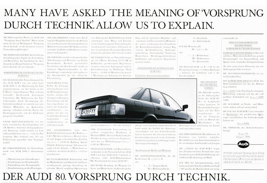 Впервые этот лозунг был использован в 1971 году в Германии во время показа линейки автомобилей NSU, прошедшего после возникновения в результате слияния компаний компани Audi NSU Auto Union AG. Компания стала называться Audi AG в 1985 году.