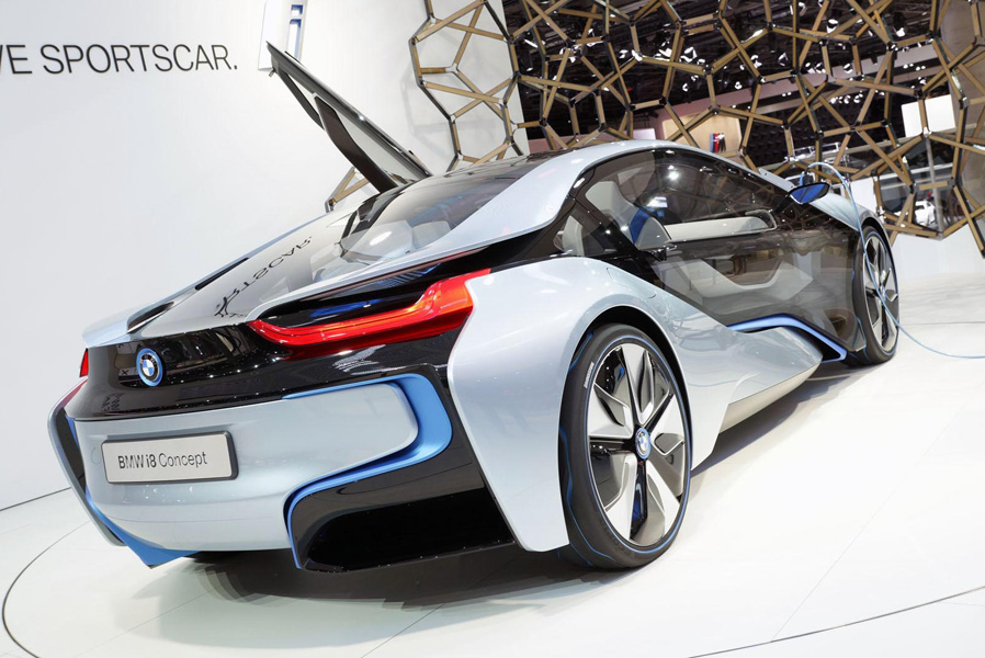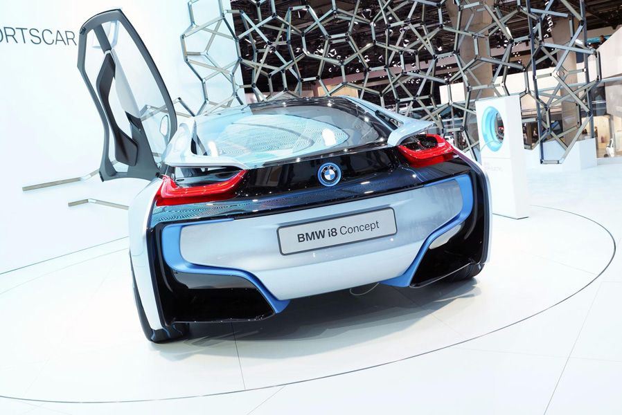 Концепт i8 является автомобилем с встроенной гибридной технологией. Турбированный 1.5-литровый 3-цилиндровый бензиновый двигатель работает вместе с электромотором. Соединённые вместе двигатели развивают до 349 л.с. мощности и выдают 550 нм крутящего момента. Благодаря такой комбинации 1480-килограммовый автомобиль развивает скорость 100 км/ч за 4.6 секунды. Максимальная скорость ограничена 250 км/ч. Дополнительно к вышесказанному стоит заметить, что i8 может проехать 35 км на электротяге. Расход топлива автомобиля равняется 2.7 л/100 км, эмиссия СО2 – 66 г/км.