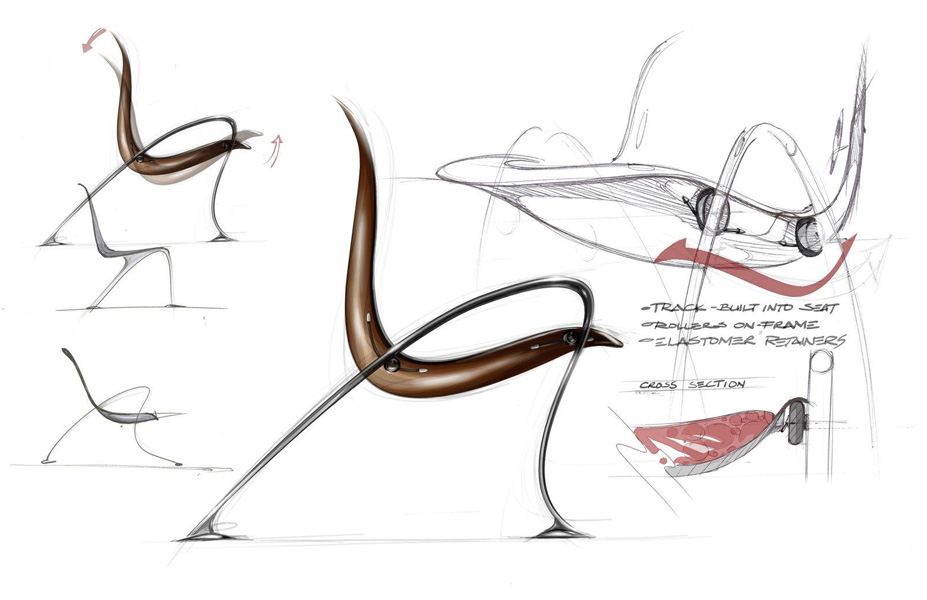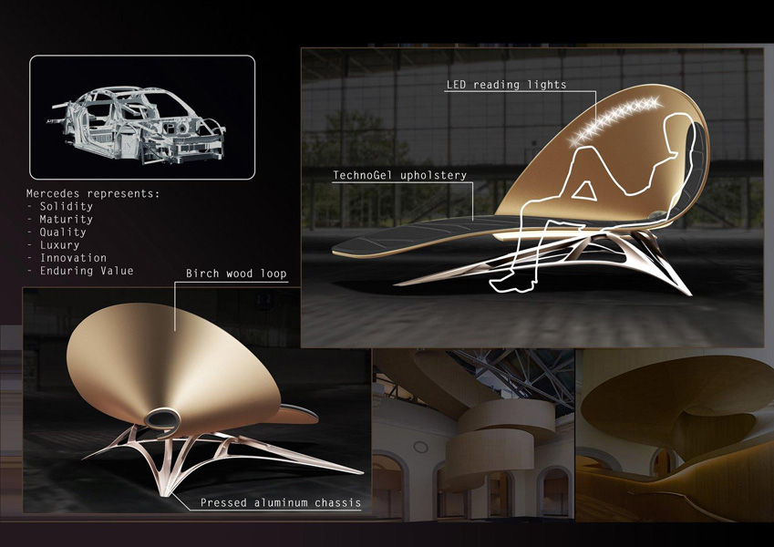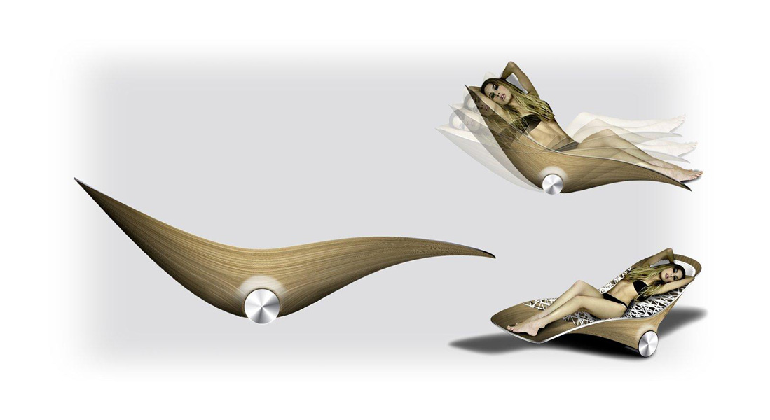 Пример инновационного дизайна мебели представлен шарнирным стулом, который перемещается относительно ручек и ножек на колёсиках в отличие от его собратьев, использующих для этой цели направляющие полозья. Другие продукты включают кресло для отдыха из берёзы со светодиодными лампами для чтения, покрытое материей, заполненной техногелем, и необычного вида шезлонг.