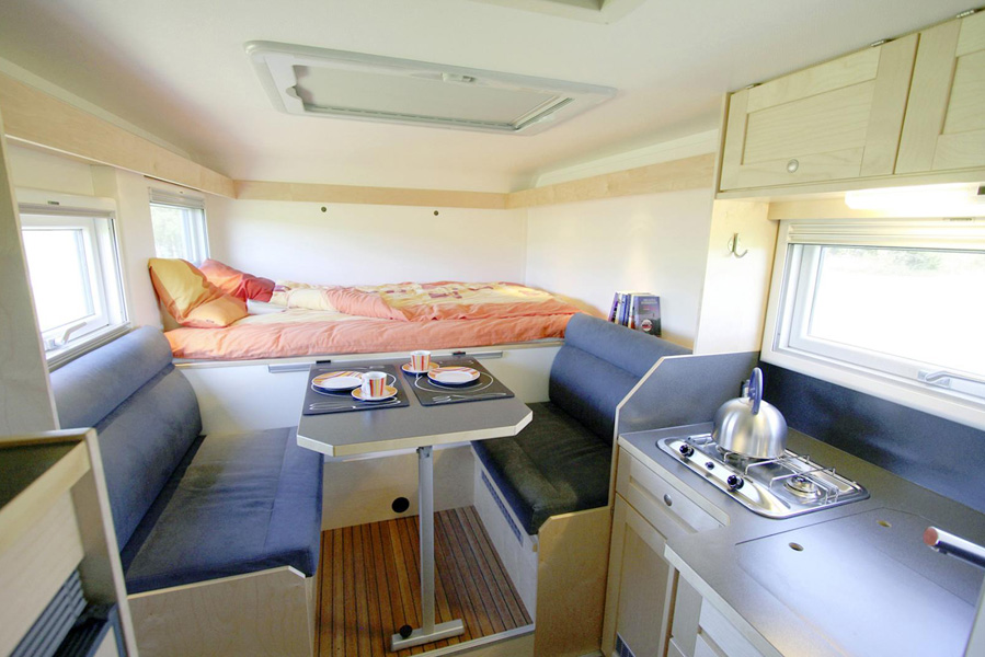 Путешественники не будут испытывать никаких неудобств вдали от дома: внутри фургона расположен 110 литровый компрессорный холодильник, небольшая ванна, душ, био-туалет и теплая вода, нагреваемая газоэлектрическим бойлером. На кухне расположена плита на 2 конфорки, раковина и дренаж.