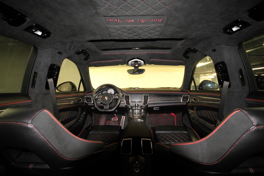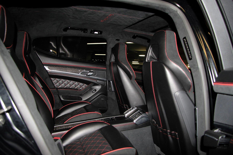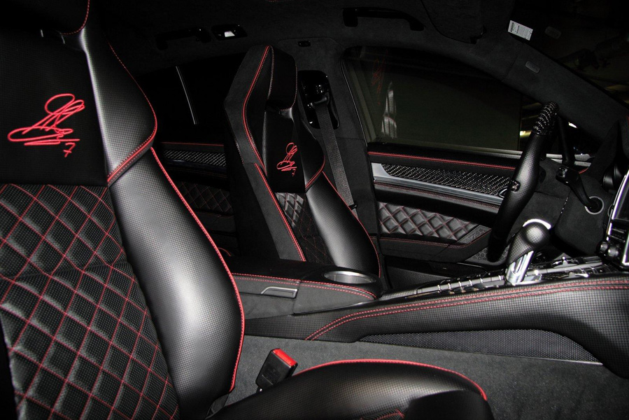 Салон автомобиля чёрного цвета с яркими красными штрихами был дополнен обивкой крыши из алькантары, основные элементы выполнены из углепластика и алькантары с красными швами. Места для ног пассажиров и водителя подсвечены красными светодиодными огнями. Внутри вы обнаружите спортивный руль, переднюю консоль и подлокотники из того же углепластика. В отделке подголовников и панели крыши автомобиля доминирует чёрный матовый цвет, на фоне которого красные логотипы выделяются особенно ярко.