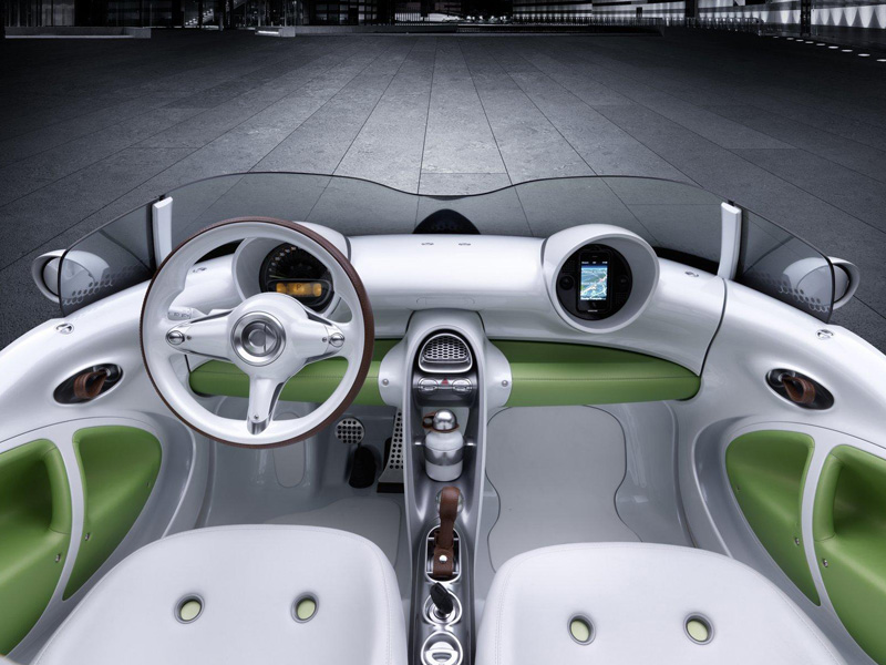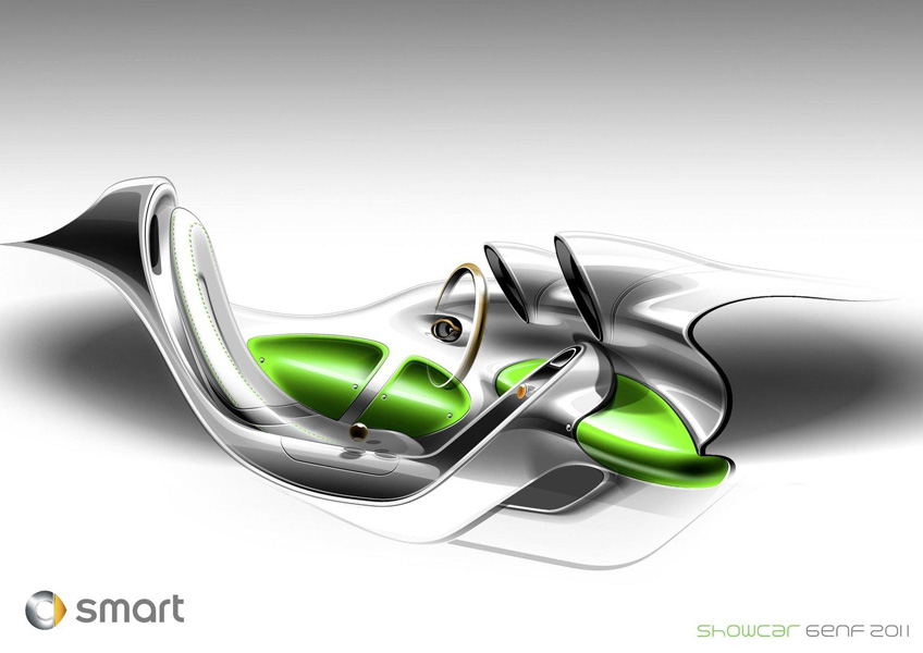 Как и у текущих моделей Smart интерьер автомобиля продолжает линию "заниженный премиум", что ярко выражено в незакрытых болтах на дверных панелях, центральной консоли и руле. Но, блестящий пластик и полированный алюминий, а так же коричневая и зелёная кожа прекрасно отвлекают на себя внимание.