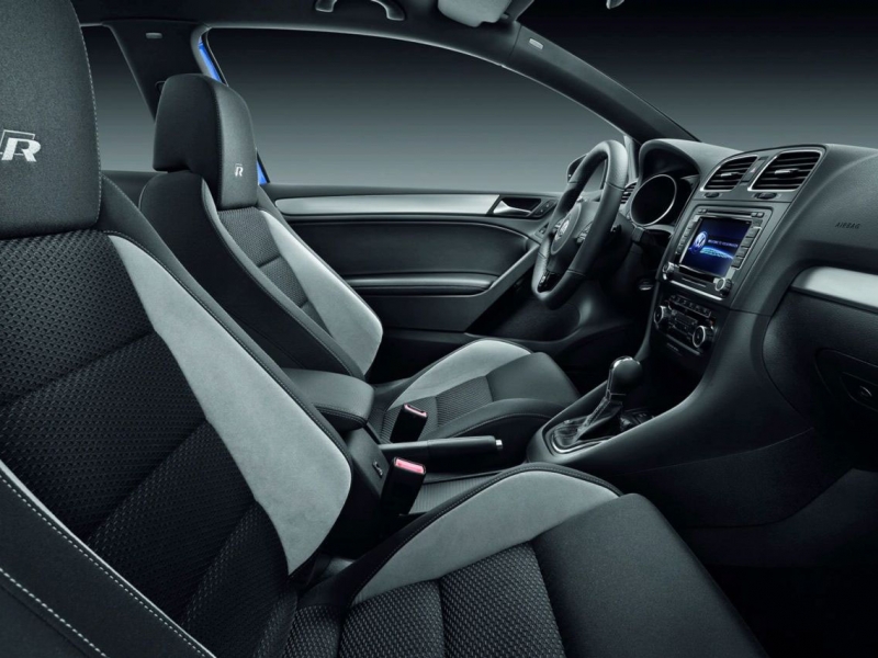 Внутри можно обнаружить интерьер из материала микрофибра с кожаными вставками, спортивные сиденья и кучу бэйджиков с буквой R.